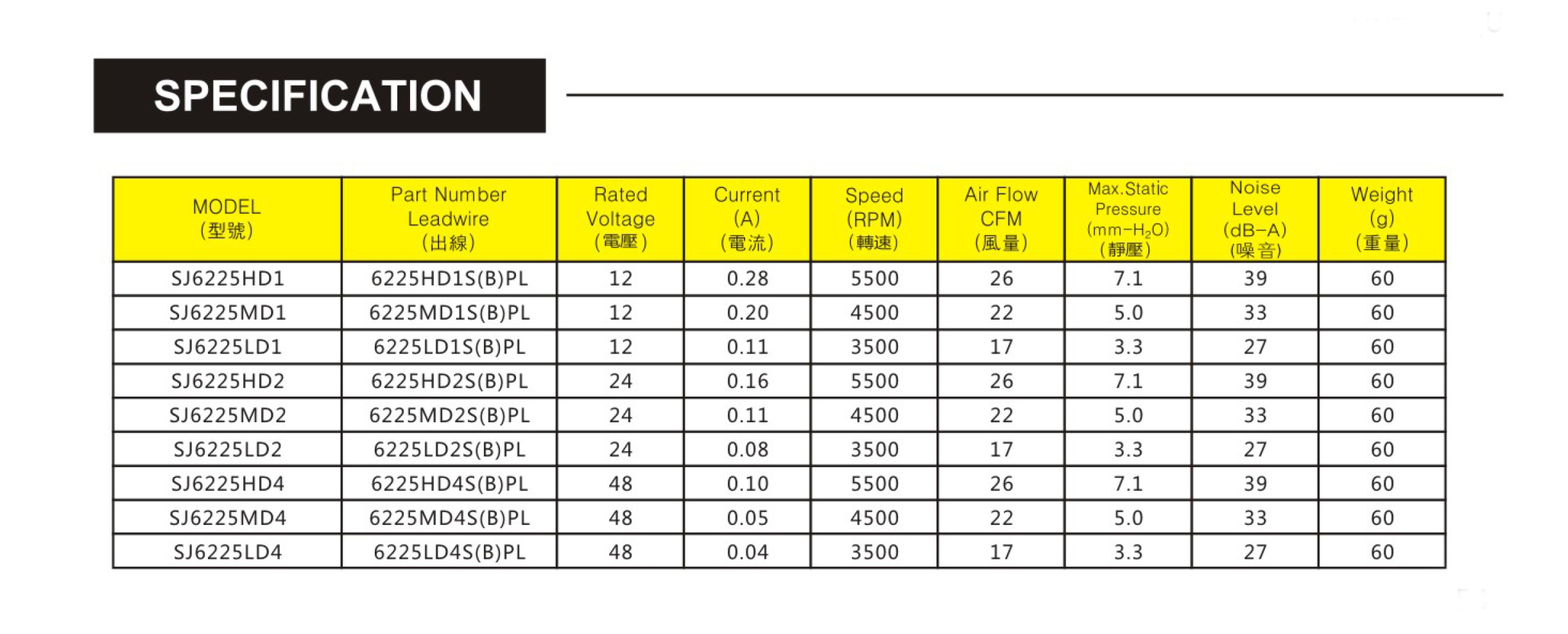 尺寸:60x60x25mm 框架: UL94V-0 PBT 轴承: 含油轴承& 双滚珠轴承 电压:DC 5V 12V 24V 48V 寿命:50 000Hours at 25℃--滚珠轴承 30 000Hours at 25℃--含油轴承 工作温度:-20℃~70℃ 正常湿度 储存温度:-20℃~85℃ 正常湿度